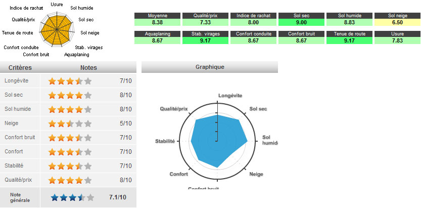 Pour déja t'aiguiller , certains sites de vente en ligne de pneus ont déja ce type d'informations très complètes, réalisées par des centaine, voires des milliers d'acheteurs d'acheteurs . Je pense à des sites comme 123pneu, pneus-online , allopneu ... qui renvoient vers ceci de http://www.pneu-test.com :