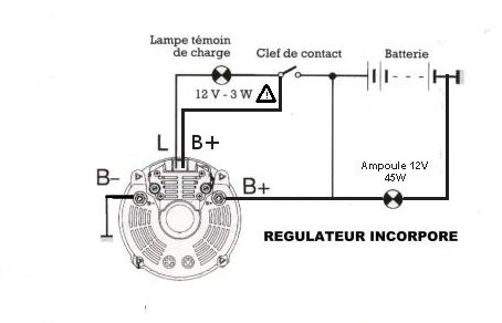 Sur la borne "L" de l'alternateur : une lampe témoin raccordée à la borne "+" batterie. Quand cette lampe est déjà allumée (alimentée par la borne précédente son intensité d'éclairage augmente quand je branche dessus le "+" alternateur -l'autre extrémité étant évidemment sur la batterie- au "-")