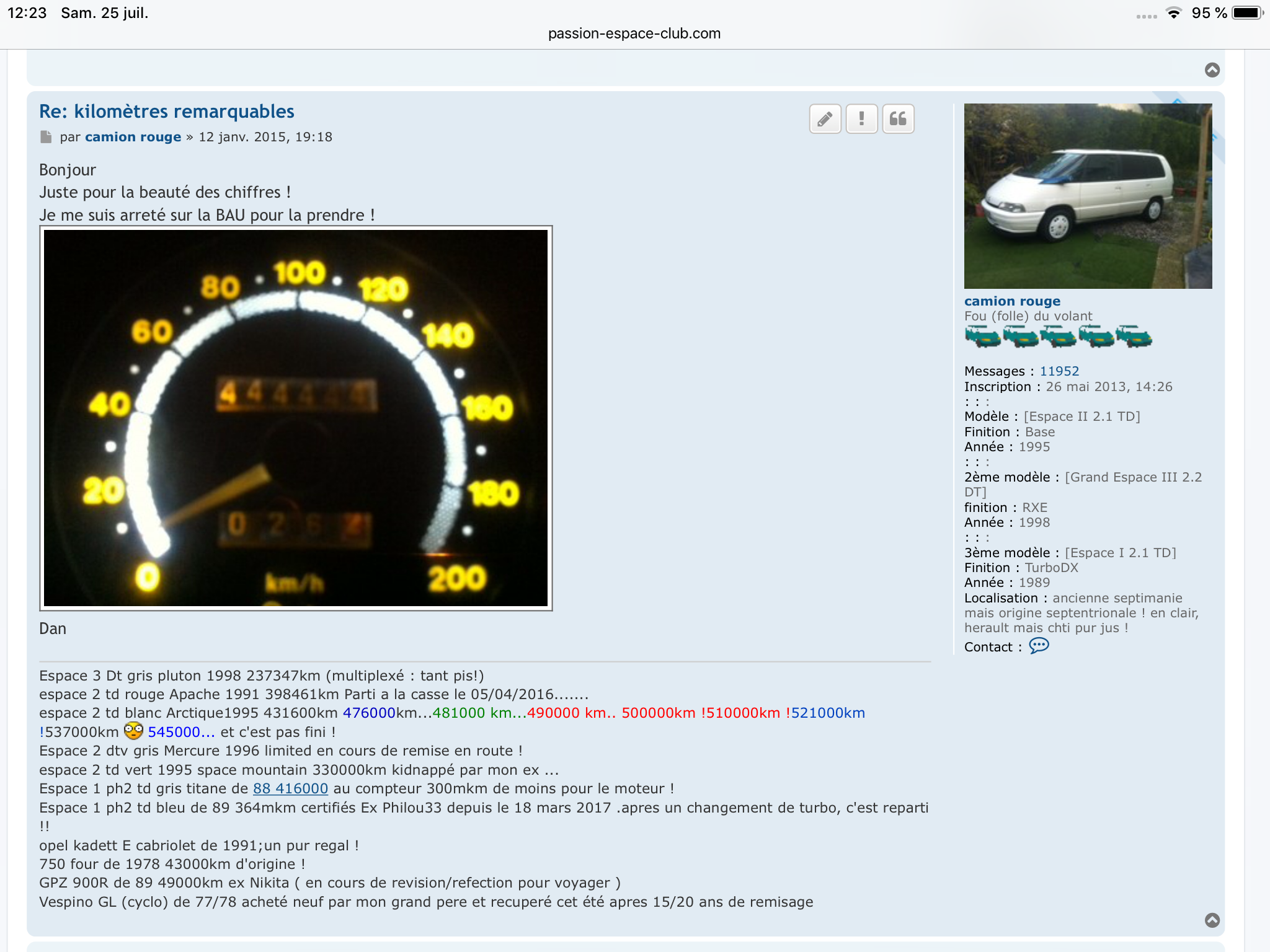 Espace 1 ph2 td bleu de 89 364mkm certifiés Ex Philou33 depuis le 18 mars 2017 .apres un changement de turbo, c'est reparti !!