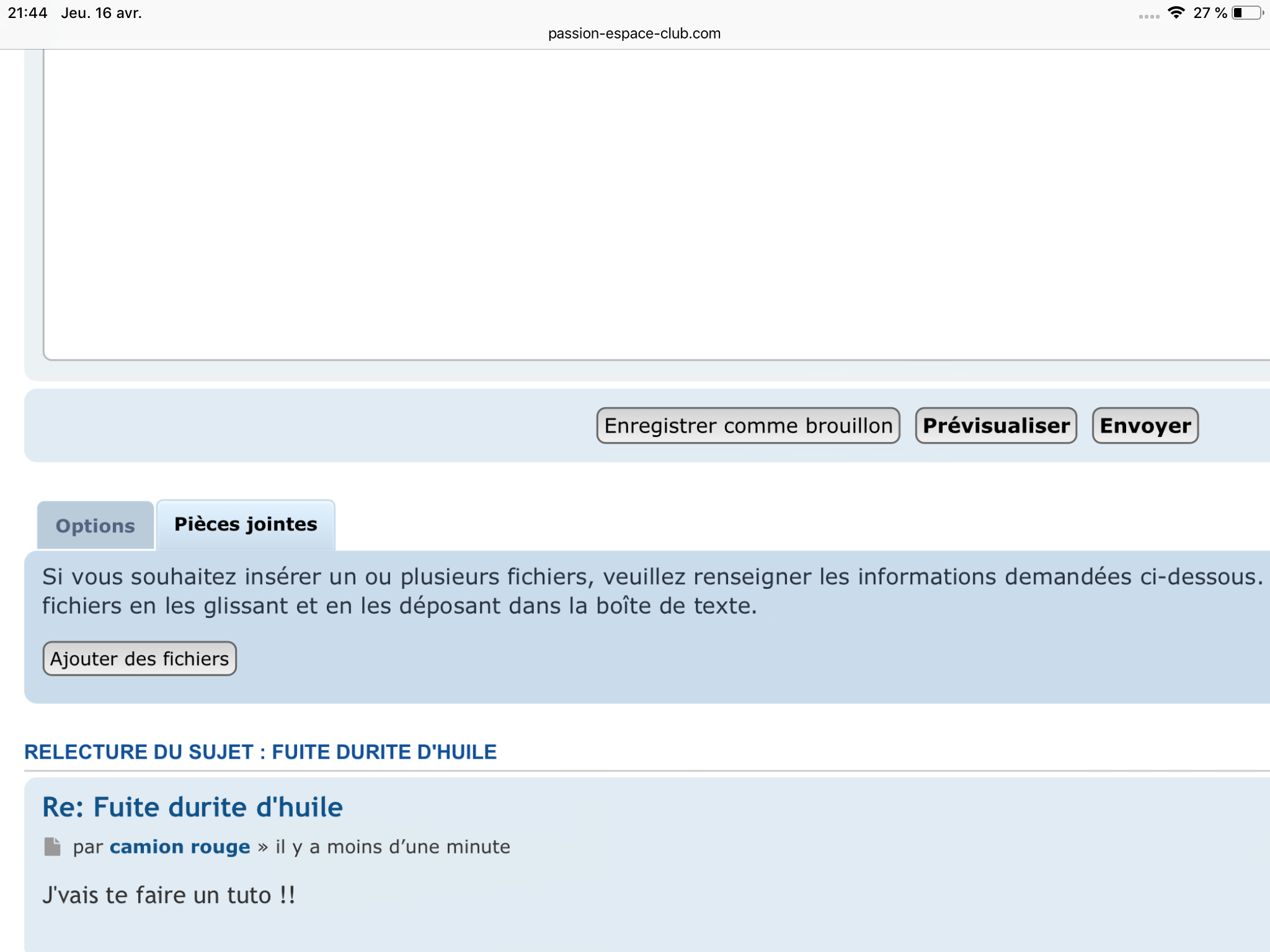 Hello, merci pour le tuto, mais ça ne marche pas car quand je clique sur "ajouter des pièces jointes", je n'ai pas la fenêtre "prendre photo ou vidéo" "Photothèque" 'Parcourir"camion rouge a écrit : 16 avr. 2020, 21:55 En 1er, tu cliques sur Repondre (pas sur reponse rapide),7F965B00-3C0A-4B7A-8453-DE0120A9C87D.png