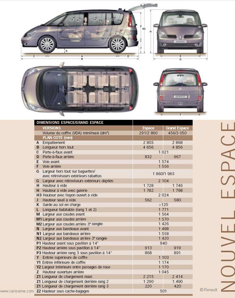 Merci pour le doc ! Une profondeur est très claire c'est la "longueur de chargement maxi = 2414", par contre la "longueur de chargement derrière rang 2 =1490" il n'est pas indiqué "maxi"; sous entendu il reste de profondeur pour les passagers et les sièges ne sont pas avancés au plus serré ( il reste 92cm assise comprise si je comprends bien ).