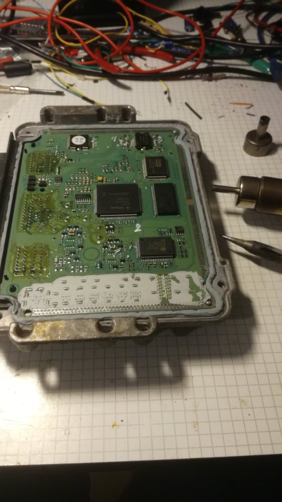 Après avoir transféré physiquement l’eeprom de l’ancien vers le nouveau calculo le véhicule a démarré sans aucun problème. J’ai acheté un DBM100 pour rien sur ce coup, le processeur de l’ecu n’étant pas un motorola je n’ai pas pris le risque de tenter une connexion sur les broches DBM pour éviter les conflits. La purge des défauts laisse apparaitre tout de même quelques soucis sur lesquels je me pencherai après un essai sur route. Je dois remonter tout le bazar (tableau de bord, sièges, garnitures…), ce sera pour la semaine prochaine.