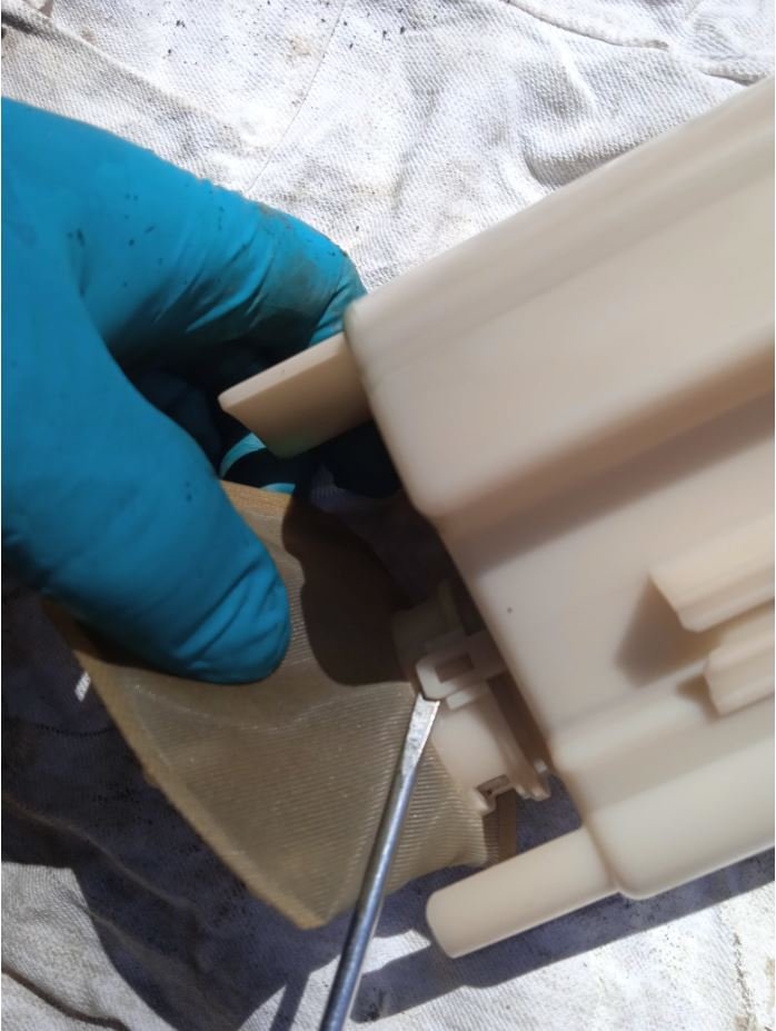 3) Dépose de ladite crépine qui est juste clipsée en 2 points, ça semble fragile, faut y aller mollo mais avec un petit tournevis ça vient tout seul.