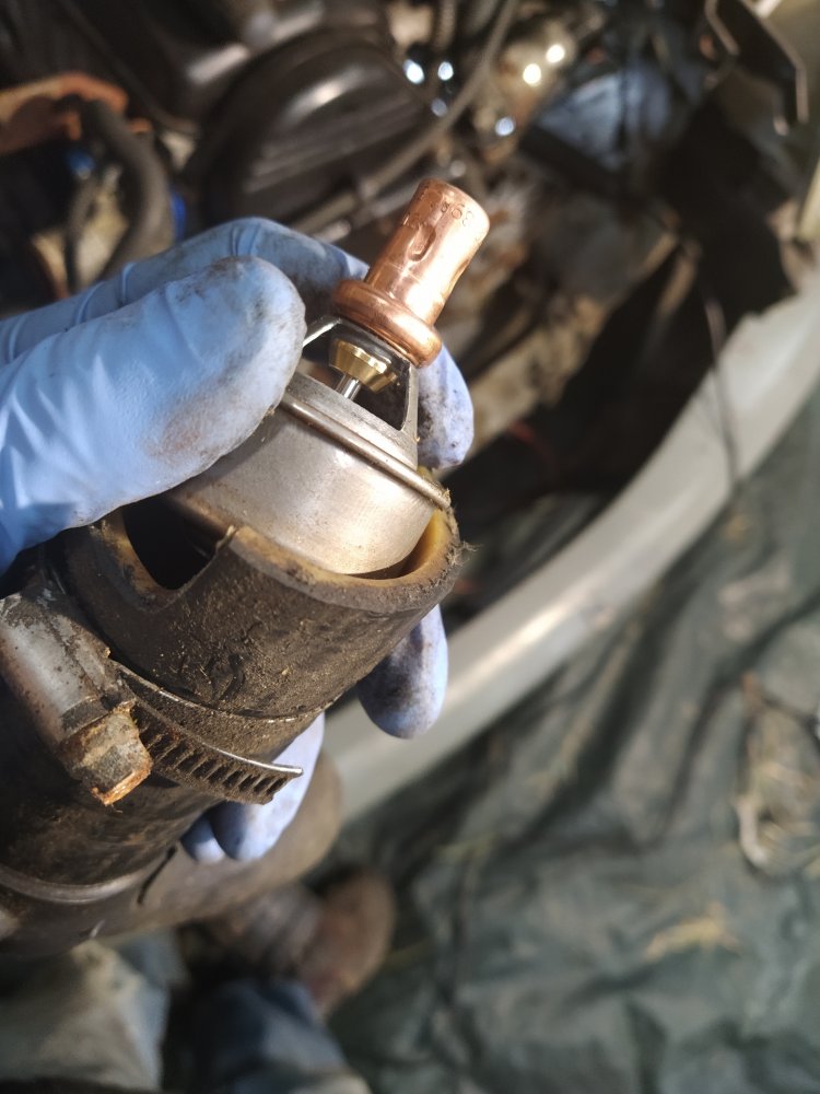 Ensuite j'ai vidangé le circuit de refroidissement et retiré les ventilateurs ainsi que le radiateur. Il semble encore bon, même si les ailettes tombent facillement... il sera remplacé une fois que le moteur sera réparé (pour le cas où je n'y arrive pas).