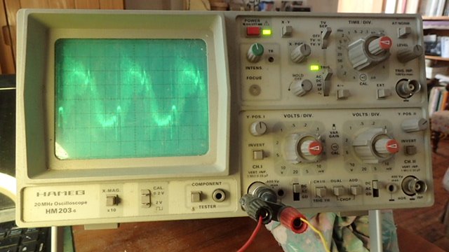Après des essais de piles (même neuves) je n'ai rien c'est à dire même pas lal LED qui scintille... J'ai branché une alim 3 V er relevé le signal aux bornes du quartz... comme les images le montre j'ai un oscillo : 20 MHz... et un signal plein de parasites (calibre 5 ms) le réseau ?