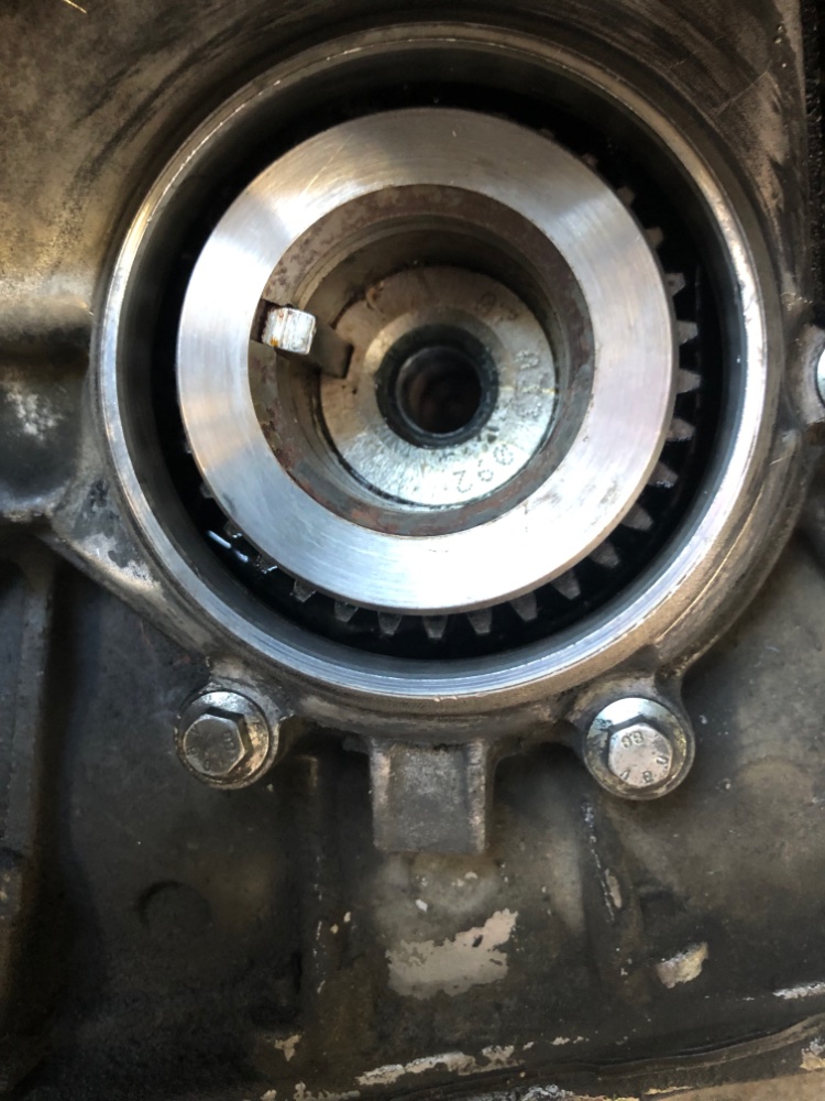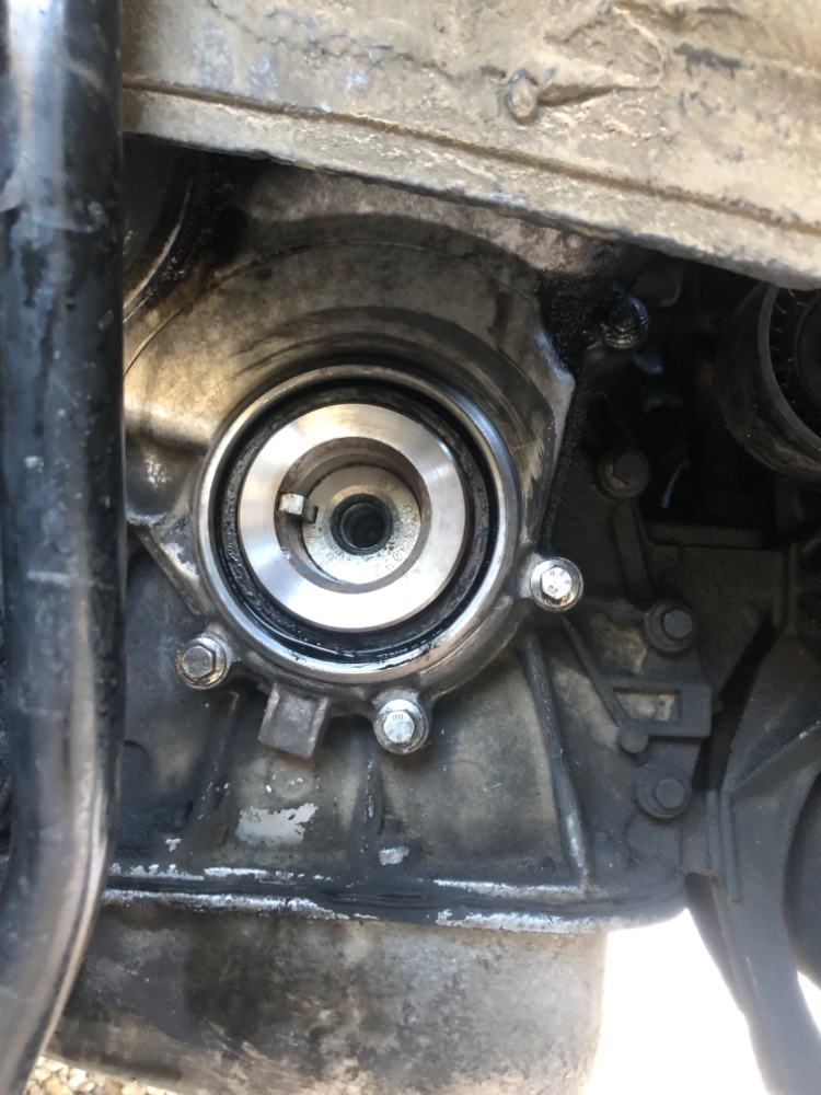 Après avoir tout nettoyé et enlevé tout les bouts de courroie coincés j’ai levé la poulie damper pour bien tout enlever derrière mais en démarrant pour vérifier ça suinte légèrement au ralenti donc le joint a changer impérativement