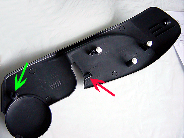 4. Retirer la garniture coté intérieur (un ergot à déplacer en partie inférieure accessible sous le siège au dessus du cylindre du prétensionneur / voir flèche rouge). La garniture est maintenue par 3 pattes, il suffit de la glisser vers le haut pour l'extraire, une fois l'ergot du bas dégagé. Un dernier ergot se trouve à l'extrémité.