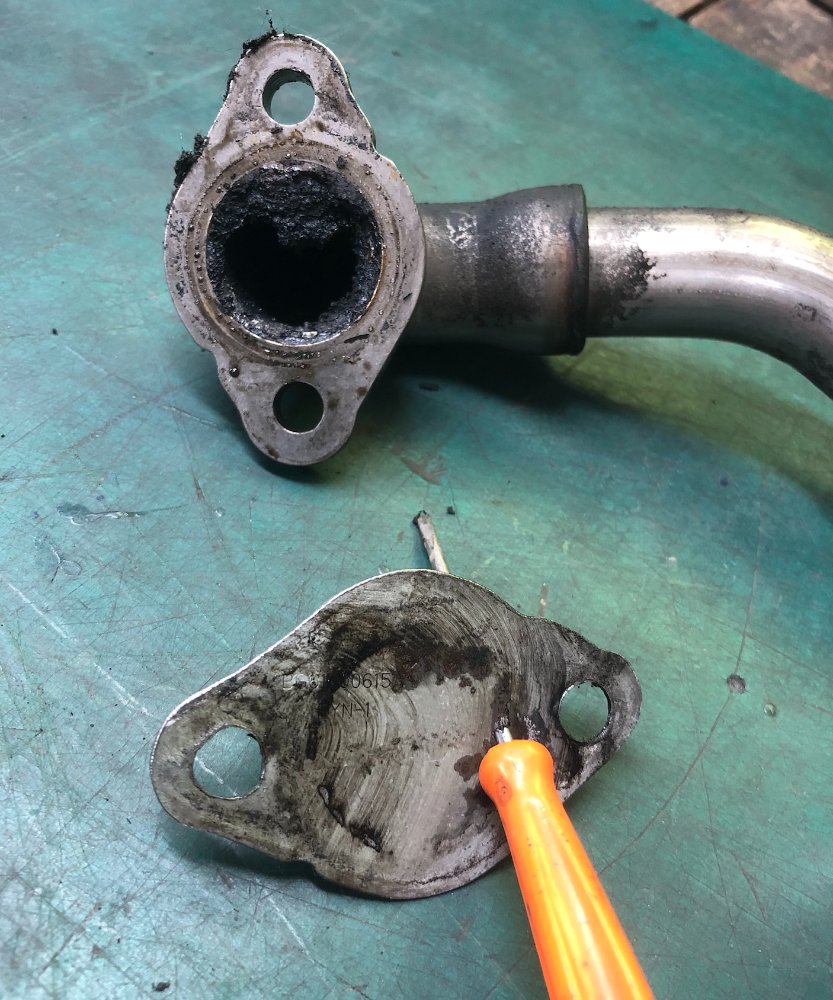 Je viens de déposer la vanne EGR ; elle devait être mûre car elle s'est ouverte en deux au démontage, les rivets de maintien ayant lâché.