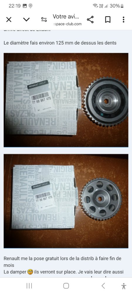 Petite question, je lis bcp que la poulie d’arbre à came avec son joint en caoutchouc au milieu est fragile est à tendance à céder avec les années entraînant une casse de la distribution.. d'ailleurs c'est ce qui était arrivé sur mon espace..