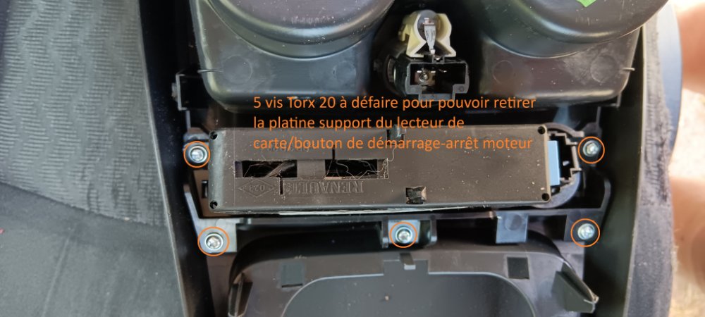 Dévisser ces 5 vis Torx pour pouvoir retirer le boîtier du lecteur de carte/bouton de démarrage-arrêt moteur
