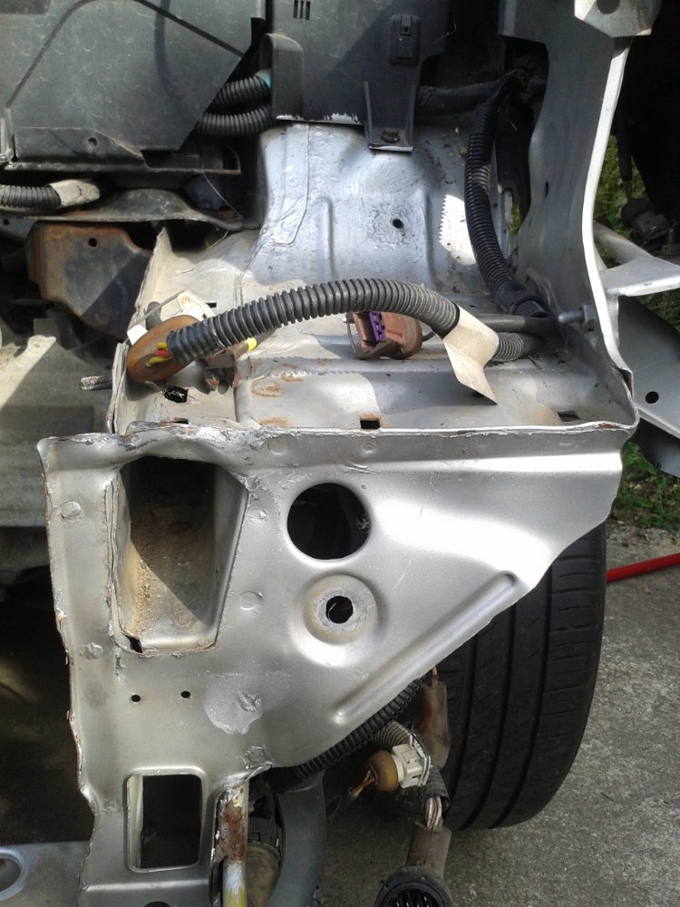 Par contre léger pliage du longeron côté conducteur entre la batterie et le "bout" côté pare choc... apparemment ça avait déja tapé à cet endroit, l'aile n'est pas d'origine (rouge dedans), et tout est un peu de guingois...