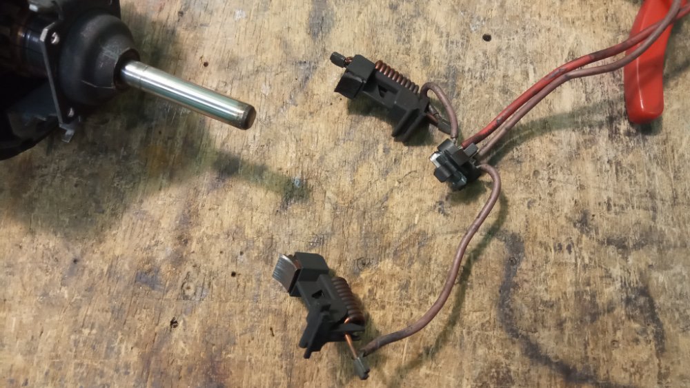 Chaque paire de charbon se démonte facilement (bien prendre des photos pour le remontage et l'affectation des différents câbles). Ici, les charbons d'origine après 19 ans d'usure.
