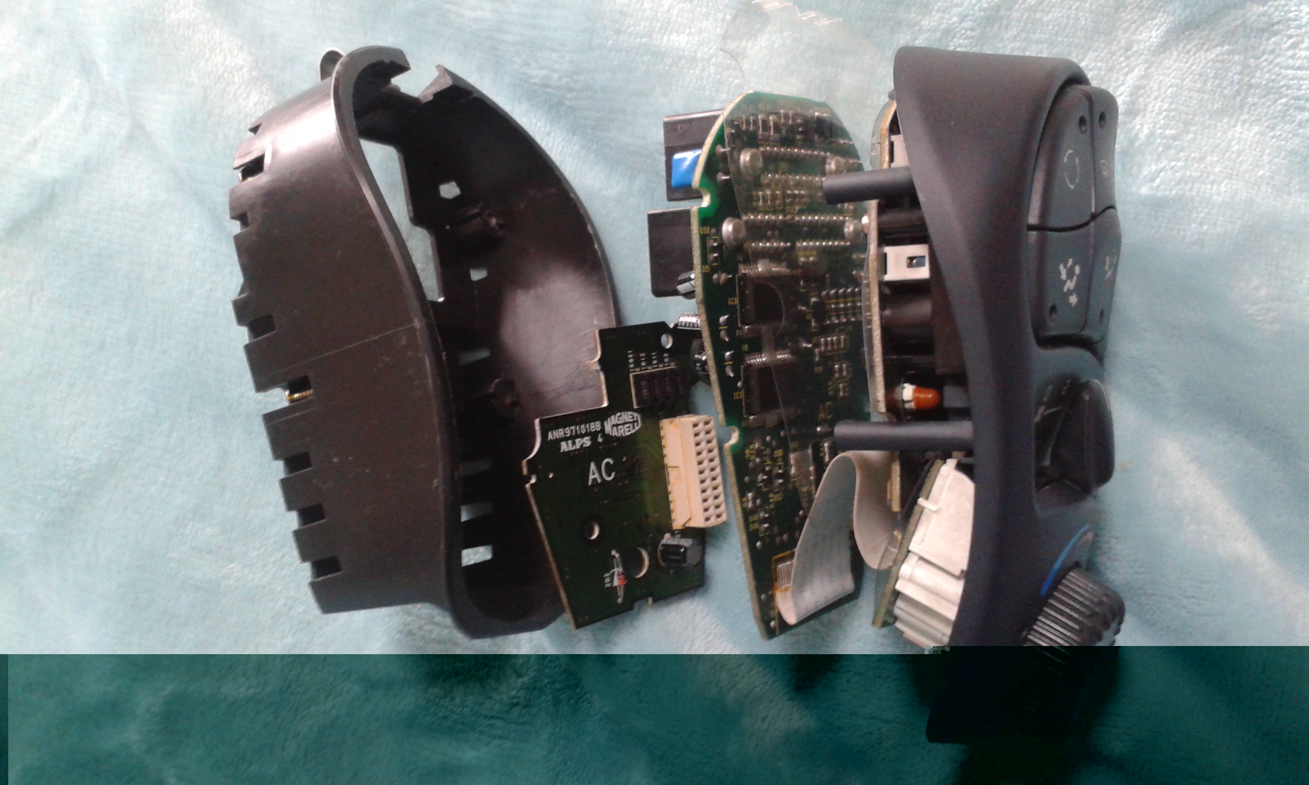 Après démontage du commodo (1 vis accessible après avoir déposer le cache supportant la commande de dégivrage AR), puis déconnection des 3 connecteurs), voici la bête: