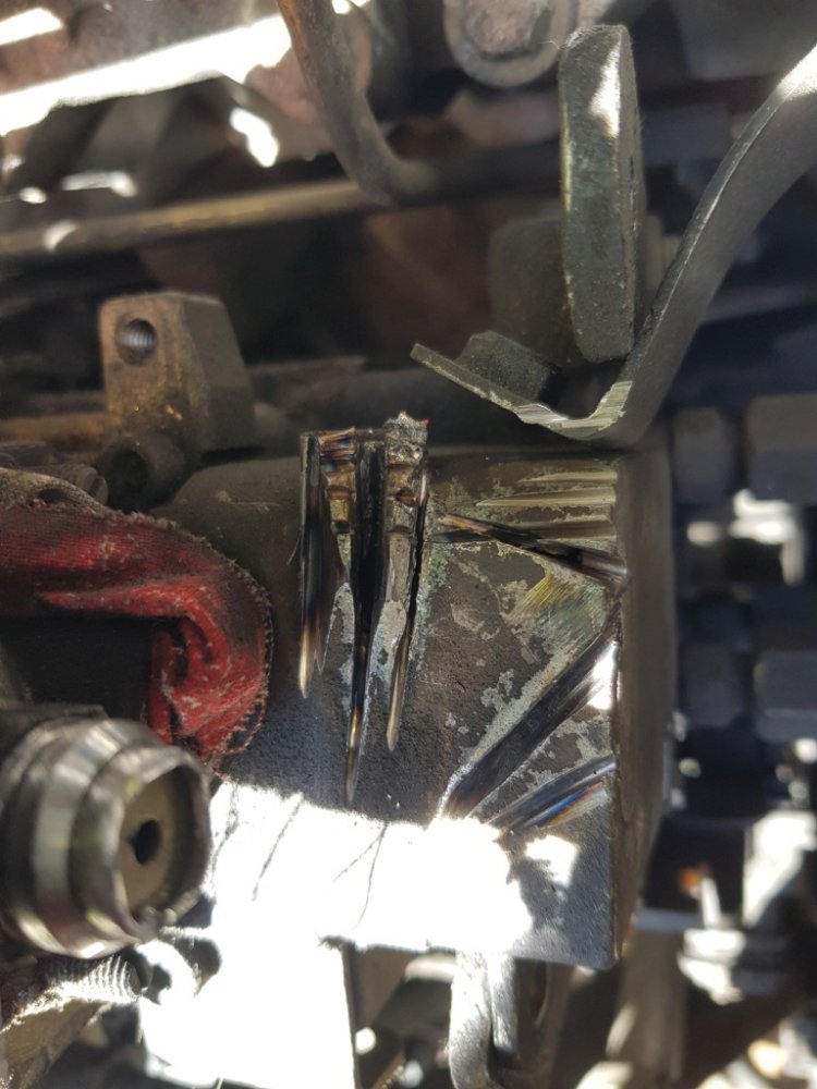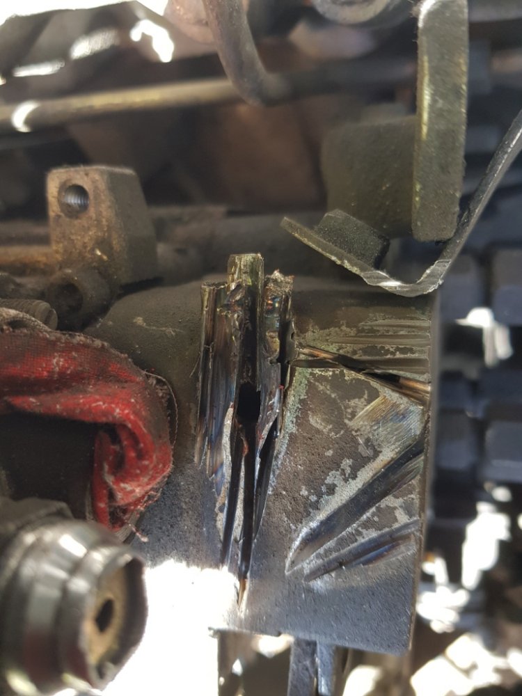Voici le blindage en question, on voit les 2 vis à tête fangible, j'ai mis un coup de disque à tronçonner sur celle du dessus et lui ai fais faire un demi tour avec un petit burin, la suite au tournevis On fait pareil pour celle du dessous En fait la difficulté n'est vraiment pas là, c'est plutôt dans la goupille élastique qui se situe au dessus coté moteur