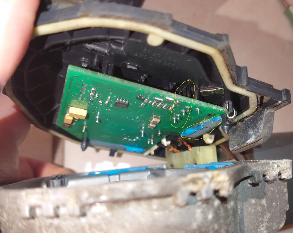 Une fois le boitier ouvert, il ne semble pas possible de dessouder les tresses de balais moteur. De +, le PCB est soude a la coque en plastique via de pins. Enfin, il y a de la colle bleu pour tranfer thermique du PCB vers la coque alu. Bref, il est pas fait pour etre demonte.