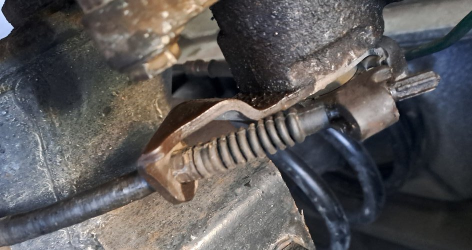 Je n'arrivais pas à bien repousser le piston droit et le soufflet caoutchouc commençait à se déchirer. En retirant avec bien du mal le soufflet, j'ai vu que le piston commençait à s'oxyder. J'ai envoyé quelques mots d'oiseau et je me suis lancé dans la dépose de l'étrier. Dépose du raccord de liquide de frein que j'ai bouché avec un bouchon de vis de purge en caoutchouc. Modèle plus petit que celui de l'Espace qui est trop gros et laisse partir l'huile. Étrier dans l'étau, J'ai sorti le piston à l'aide du levier de frein à main. Nettoyage du piston à la laine de fer d'ébéniste, nettoyage du cylindre, j'enduis le tout d'huile de frein et de la graisse de frein dans le soufflet. Pour remonter le tout, il faut mettre le soufflet sur piston, bien sorti côté cylindre et mettre le soufflet dans la gorge du cylindre avant de pousser le piston dans le cylindre. Sinon, il m'était impossible de replacer le soufflet coté cylindre. Comme le soufflet était un peu déchiré, j'ai mis la déchirure en bas pour que l'eau n'y aille pas. Comme tout est propre et qu'avec le piston sorti, le repousse piston ne rentrait pas, j'ai tourné le piston dans le sens des aiguilles d'une montre avec une pince multiprise sur la partie extérieure du piston en même temps que je poussais le piston avec l'autre main.
