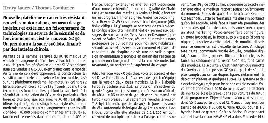 Pour info : dans les pages auto du Télégramme (journal du Finistère) il y a un article dithyrambique sur le xc90.