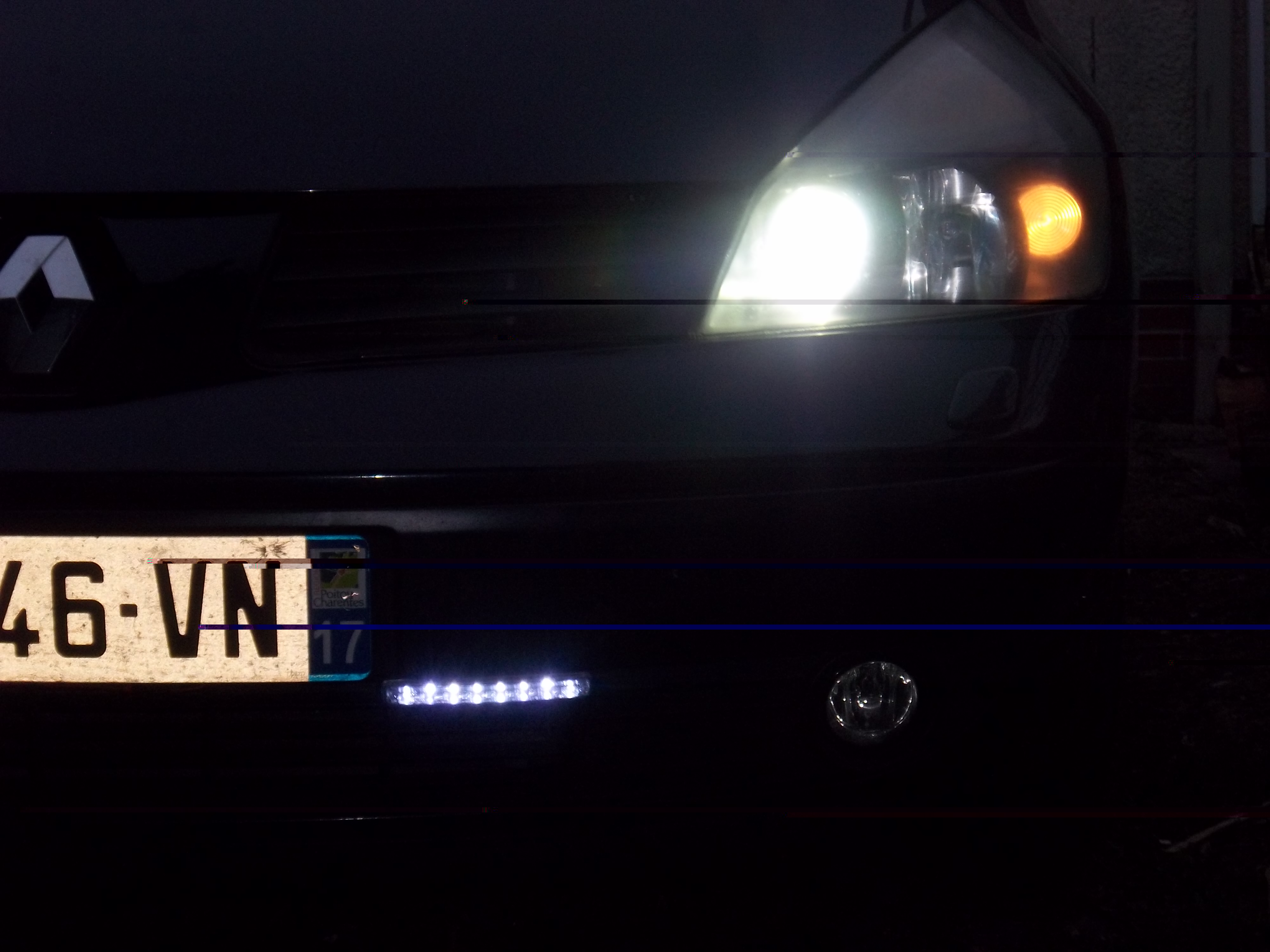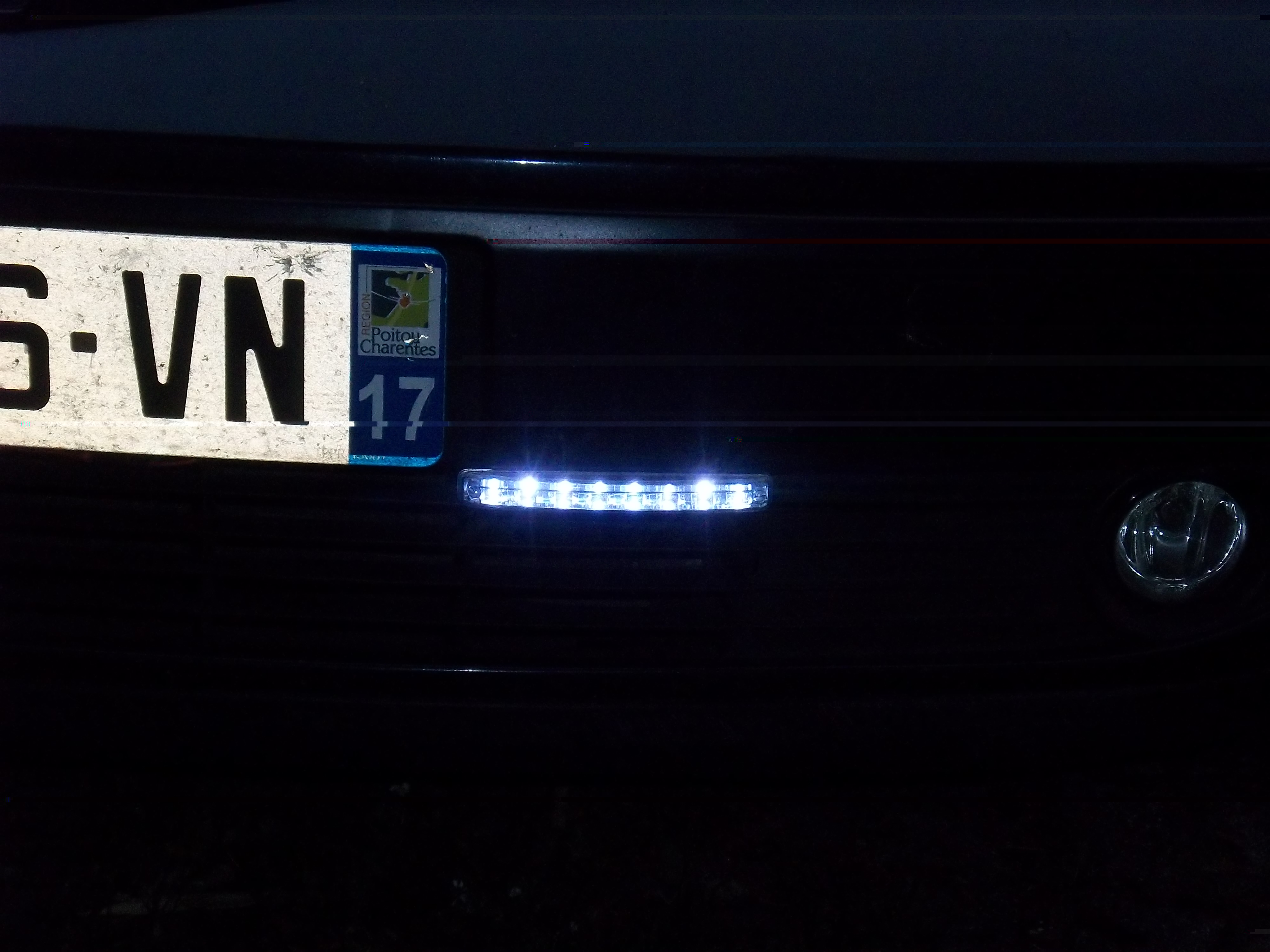Feux de jour montés et branchés, avec un DRL pas mal, puisque différant son extinction 30sec après coupure du moteur, histoire de voir où l'on met les pieds en sortant, et diminuant l'intensité des feux lorsque les phares sont allumés