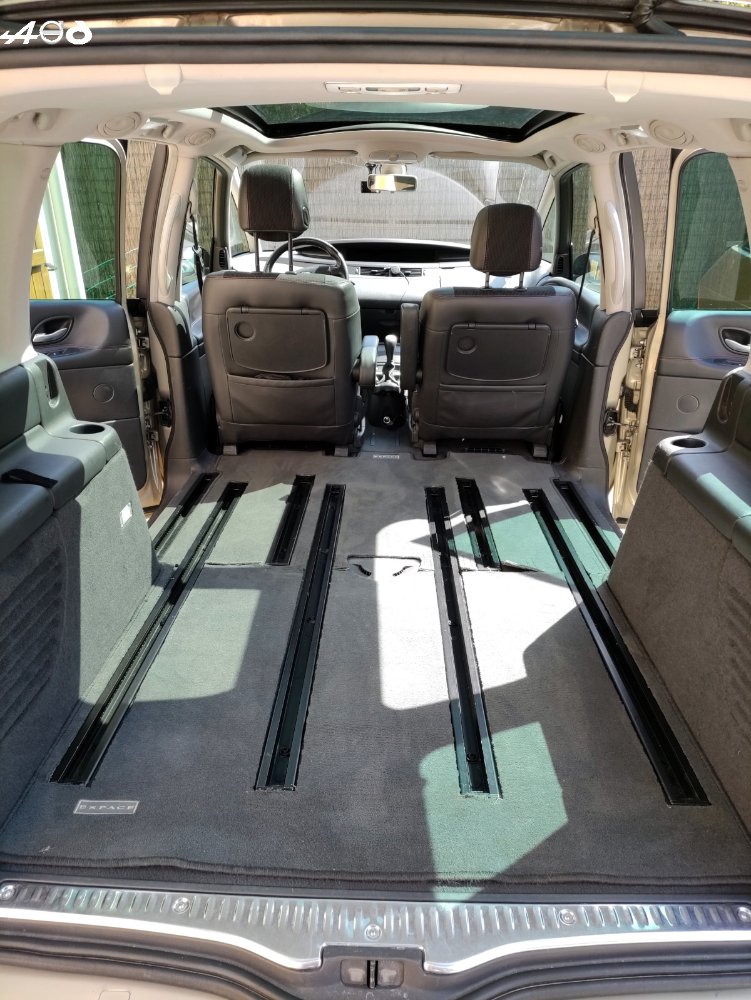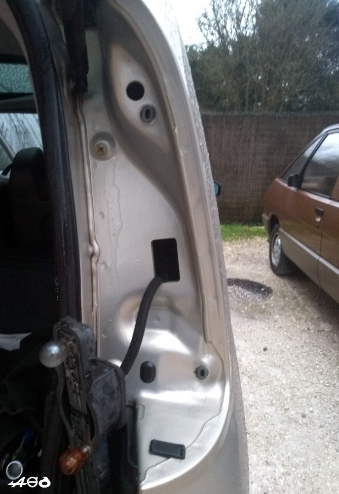 J'ai réussi à trouver un tapis de coffre qui me laisse la possibilité d'utiliser les rails et donc la modularité offerte par ces derniers, c'est tout con, mais j'en avais marre de plier les tapis de sol à chaque utilisation des glissières. Juste avant, je pose ma voiture en rendant visite à mon principal client et je la retrouve le soir avec la vitre passager descendue dans la porte... verdict assez rapide à déduire... mécanisme HS ... J'ai réussi à en trouver un assez rapidement (à croire que Renault savait que les mécanismes étaient de mauvaise qualité) Mention spéciale aux ingénieurs qui ont pensé à riveter les logements d'enceinte sans laisser la place pour accéder à un des écrous qui permettent de changer le mécanisme. J'ai trouvé deux accoudoirs AR d'occasion... Et le must, j'ai installé la caméra de recul grâce à l'excellent tuto de Onfre...