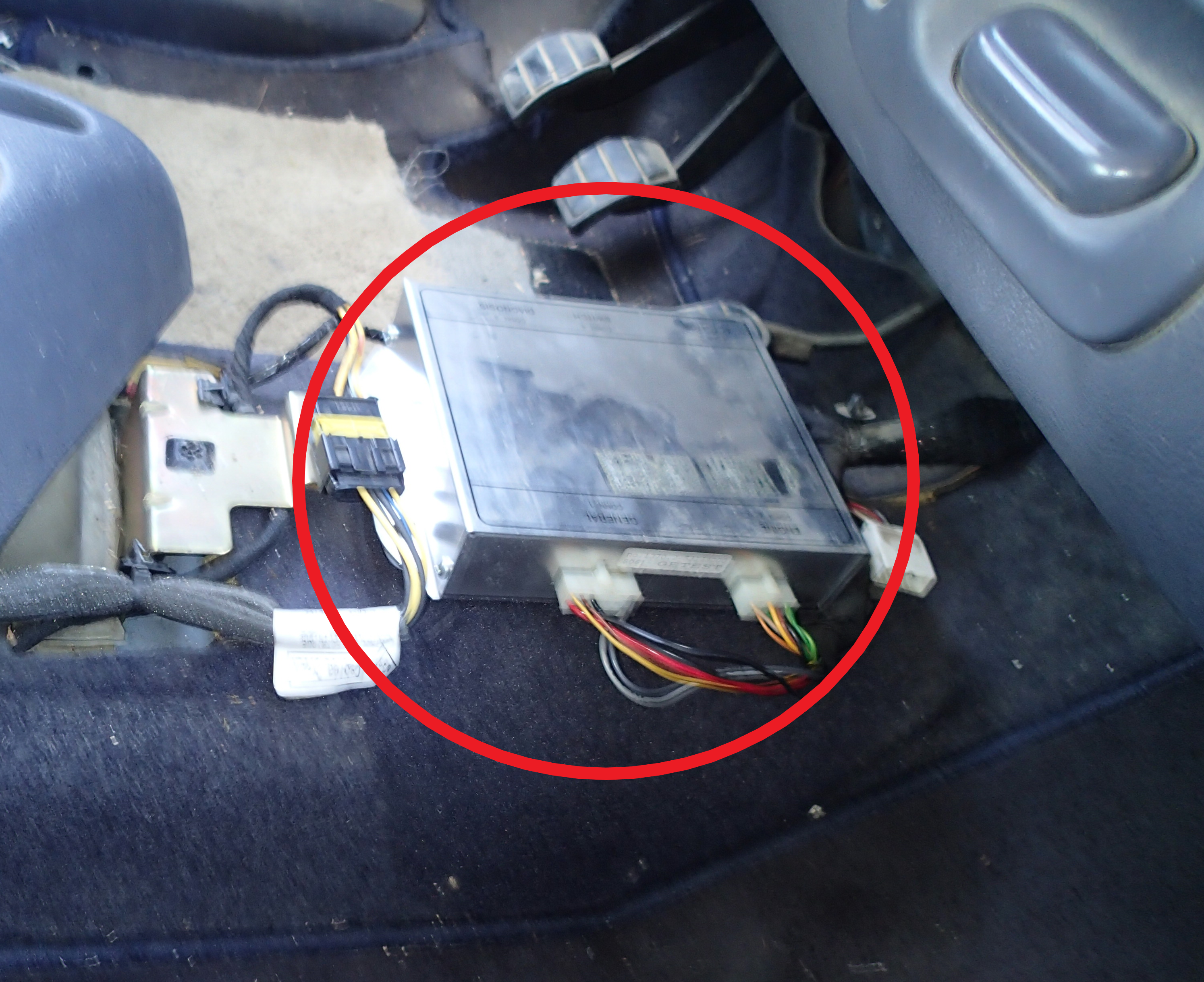 sous les pieds du passager, sur le mien, il y a trois connecteurs comme ceux sous les sièges, dans mon cas cachés sous la plaque en métal noire sur la boite a fusibles, qui cache la partie entre les deux parties, pas de barre au milieu sur l'espace vert... regarde mes photos sur mon sujet, c'est assez parlant.