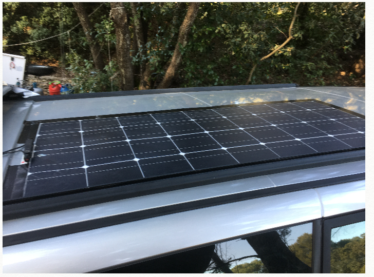 j'ai donc choisi un Flexible 100w. C'est moins efficace qu'un panneau sur cadre aluminium,(à cause du moindre refroidissement sous le panneau) mais c'est bien plus léger (2,2kg au lieu de 8,8kg) et surtout il n'y a pratiquement pas de prise au vent car d'une épaisseur de 6mm au lieu de 35mm.