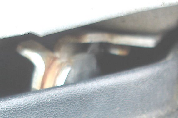 Je me suis mis à dévisser les boulons M6 sur chaque charnière. Ce n’était pas une affaire simple ! Un axe d'essuie-glace est placé exactement là où la clé devait tourner, mais le retrait de l'écrou de l'axe a aidé. Les boulons supérieurs n'étaient pas trop difficiles mais il m'a fallu plusieurs heures de frustration croissante pour dévisser ceux du bas mais avec l'aide d'une clé de 10 mm spécialement pliée, j'ai finalement réussi à libérer le capot de ses charnières. J'ai constaté que le bord arrière du capot pouvait être relevé d'environ 2,5 cm. J'ai inséré une cale en bois pour maintenir cet espace et à l'aide d'une bonne torche je pouvais maintenant voir les deux loquets.