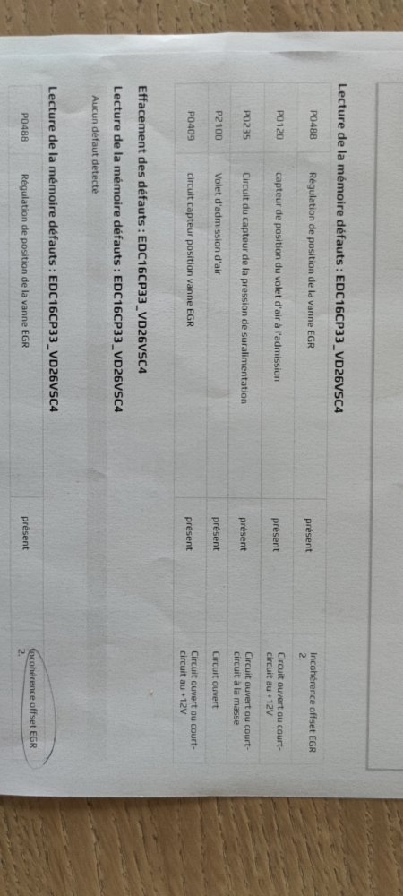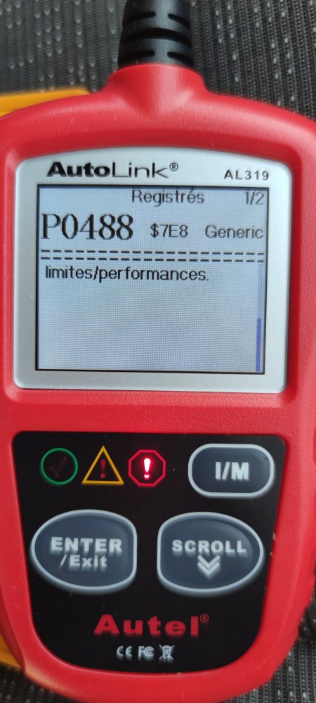 Et un code " P0488 commande de position de papillon de recyclages des gazs d échappement, limite / performance " a la valise qui a été effacé tant bien que mal par une valise Renault, pour réapparaître le lendemain et ne plus partir.
