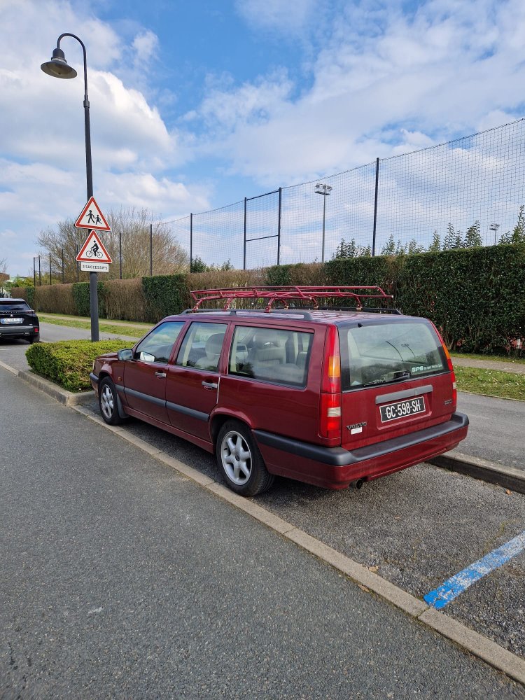 Il s'agit d'une VOLVO 850 Break, de couleur rouge, immatriculée GC-598-SH, en plaques noires.
