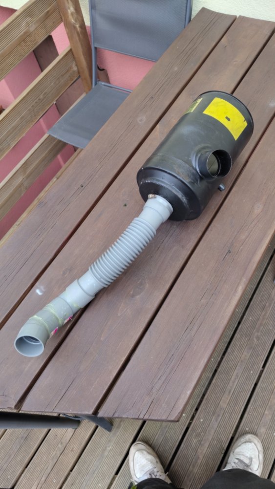 J’ai acheté un raccord souple en 50 mm, quelques coudes du même diamètre et j’ai assemblé le tout à la colle néoprène. J’ai ajouté une petite grille à l’avant pour protéger l’entrée, histoire de faire les choses bien.