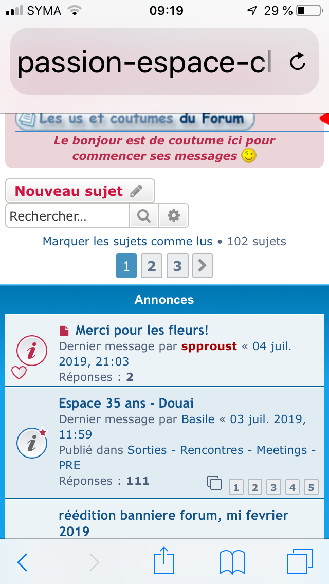 N'oubliez pas si vous le pouvez d'envoyer par mail en sauvegarde les fichiers que vous joignez à vos messages à fichiers@passion-espace-club.com, pour qu'on puisse les restaurer si un problème a lieu.![]()