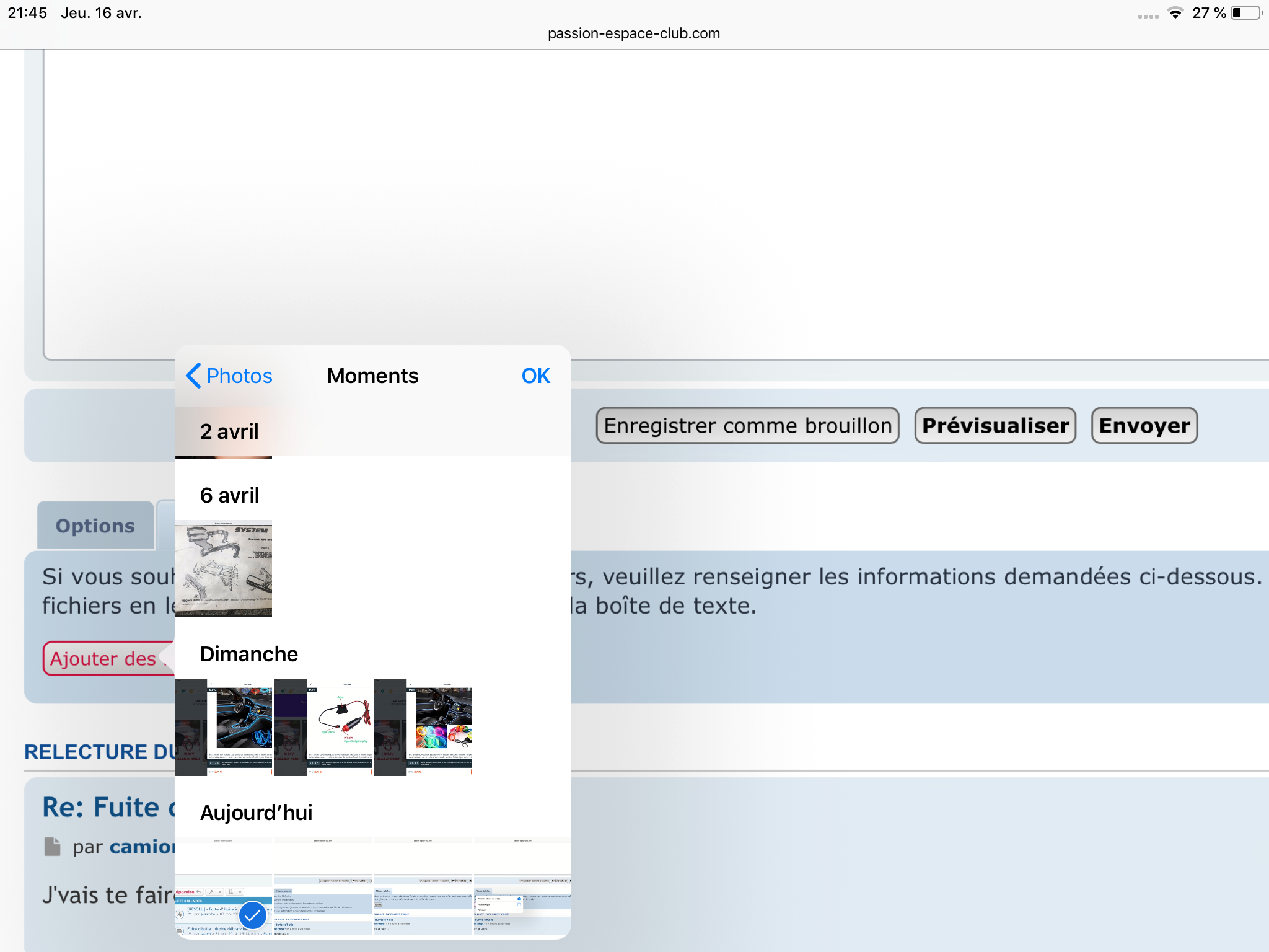 Hello, merci pour le tuto, mais ça ne marche pas car quand je clique sur "ajouter des pièces jointes", je n'ai pas la fenêtre "prendre photo ou vidéo" "Photothèque" 'Parcourir"camion rouge a écrit : 16 avr. 2020, 21:55 En 1er, tu cliques sur Repondre (pas sur reponse rapide),7F965B00-3C0A-4B7A-8453-DE0120A9C87D.png