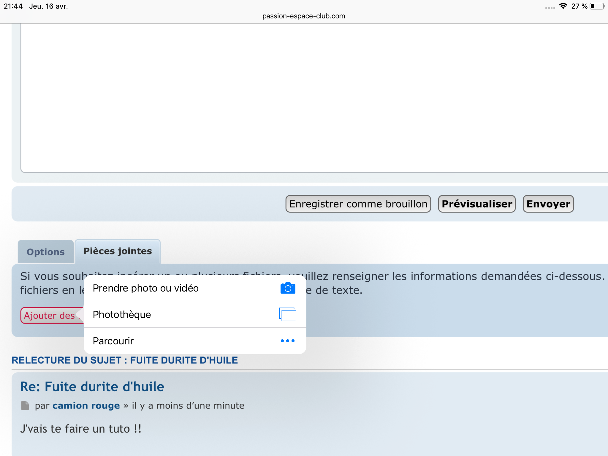 Hello, merci pour le tuto, mais ça ne marche pas car quand je clique sur "ajouter des pièces jointes", je n'ai pas la fenêtre "prendre photo ou vidéo" "Photothèque" 'Parcourir"camion rouge a écrit : 16 avr. 2020, 21:55 En 1er, tu cliques sur Repondre (pas sur reponse rapide),7F965B00-3C0A-4B7A-8453-DE0120A9C87D.png