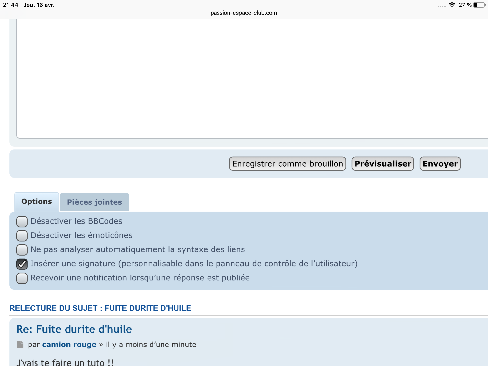 Hello, merci pour le tuto, mais ça ne marche pas car quand je clique sur "ajouter des pièces jointes", je n'ai pas la fenêtre "prendre photo ou vidéo" "Photothèque" 'Parcourir"camion rouge a écrit : 16 avr. 2020, 21:55 En 1er, tu cliques sur Repondre (pas sur reponse rapide),7F965B00-3C0A-4B7A-8453-DE0120A9C87D.png