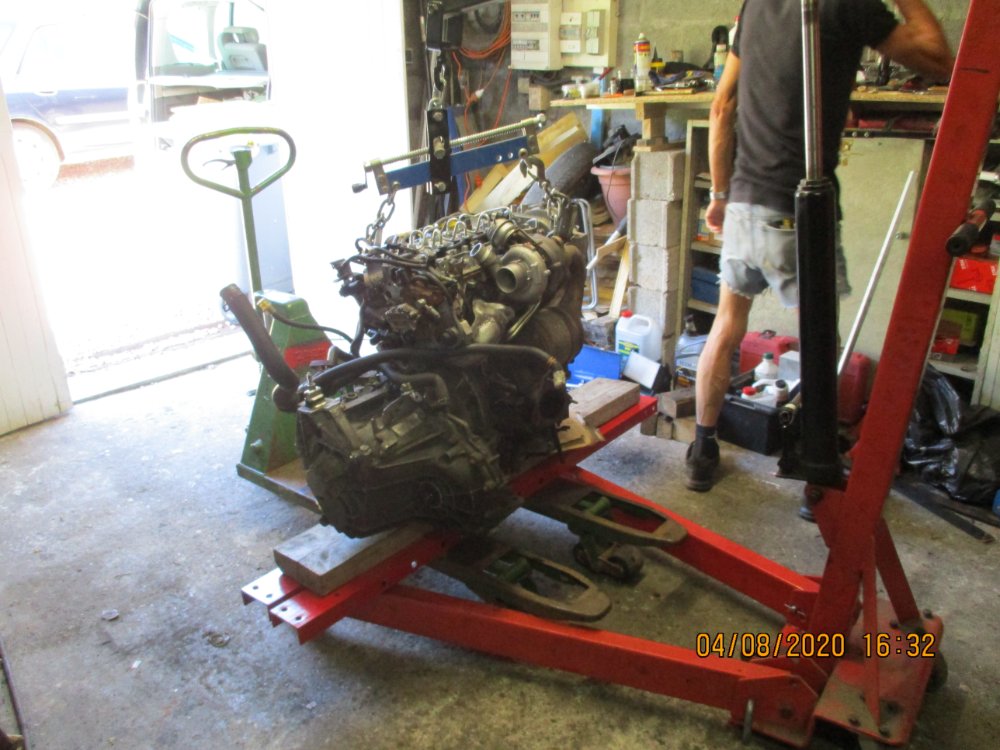 Vendredi 07/08 : repose cardans, échappement, mise à niveau des liquides et purges (LDR, embrayage, huile moteur et DA). Fini remontage des diverses pièces en fin de matinée mais gros soucis, impossible de remettre la traverse en façade, 1 cm d'écart!!! Pourtant, sur le même genre de travaux sur mon 1.9l, pas de soucis à ce niveau !??