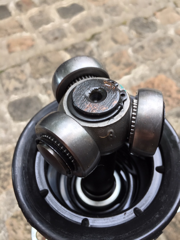 Embêté par ce bruit qui semblait être un bruit de frottement de plaquettes sur disques, j'ai levé l'avant gauche pour mettre la roue en l'air. Le bruit semble provenir de la sortie de boîte gauche. Il y a à cet endroit une sorte de bague qui semble être en plastique blanc (PTFE?), cette bague est assez mobile en axial et le cardan semble tourner à l'intérieur.