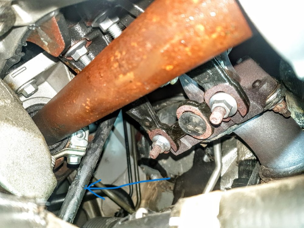 Comme expliqué précédement,du gasoil sortait par un tuyau en caoutchouc noir dirigé vers le sol. ce tuyau ressort vers le coté droit du moteur (coté passager)