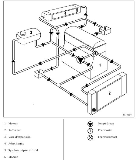 voilà le schéma pour ton 1: Il est aussi noté que la circulation se fait en continu dans l'aérotherme, pas de "robinet" qui ouvre ou ferme le truc.