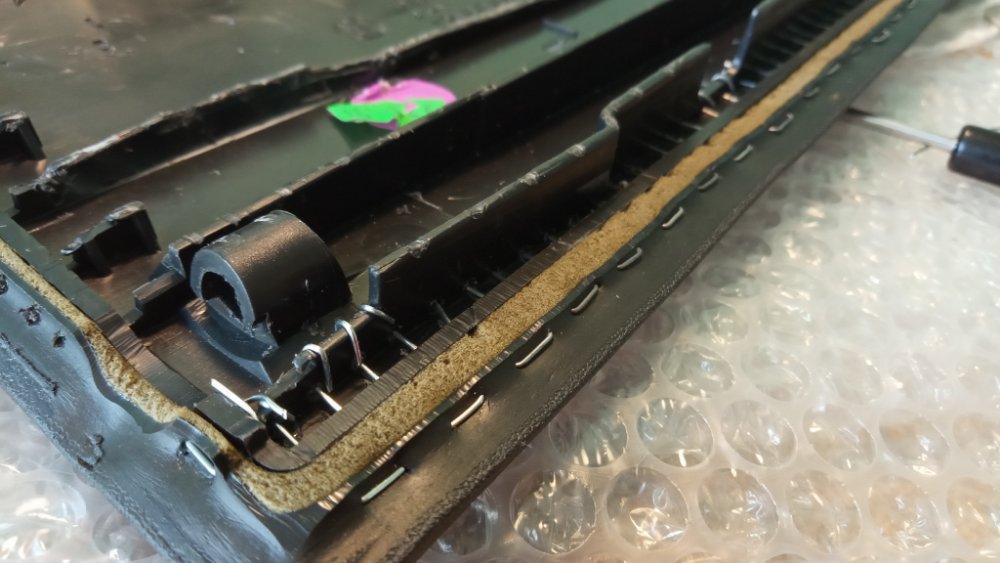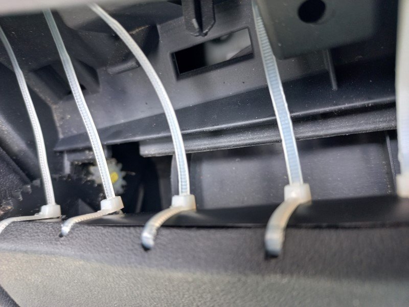 Etape suivante : bloquer une journée complète pour réparer cela à ma façon. En effet, il faudra déposer la planche de bord complète, cela demande du temps, de la minutie, de la méthode et encore du temps... Après deux bonnes heures à déposer les différents éléments, j'accède enfin au portillon. Comme je m'y attendais, les deux parties sont soudées ensemble par ultrasons. C'est très solide mais on parvient à séparer l'ensemble avec un peu de méthode. Les bords, moins soumis aux contraintes sont cousus à l'aide d'un fil et une boucle est réalisée à chaque point, cela permet de doser la tension sur le fil selon la nécessité.