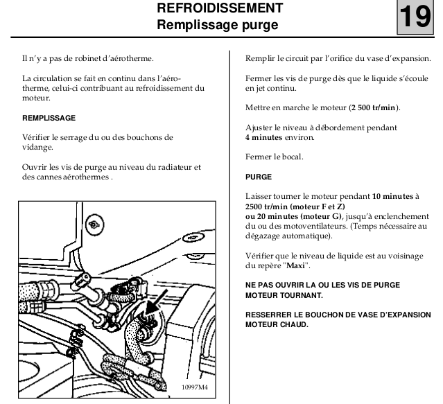 je purge en remplissant, puis une fois le moteur en marche (sans l'arreter), régulièrement jusqu'au déclenchement du ventilo + radiateur chaud.
