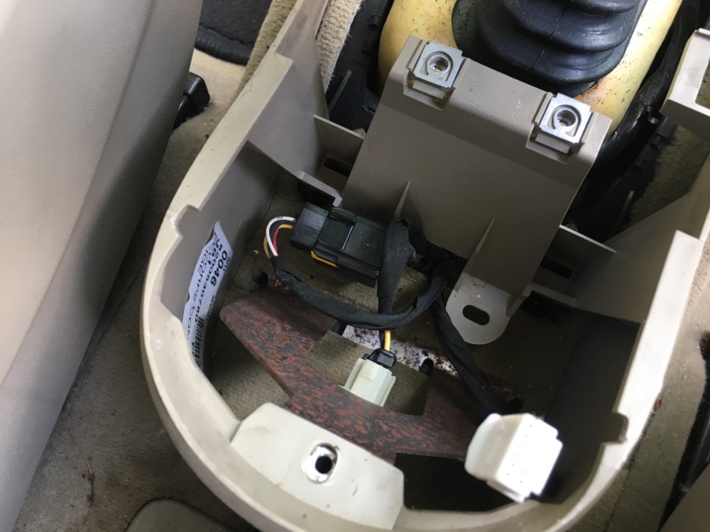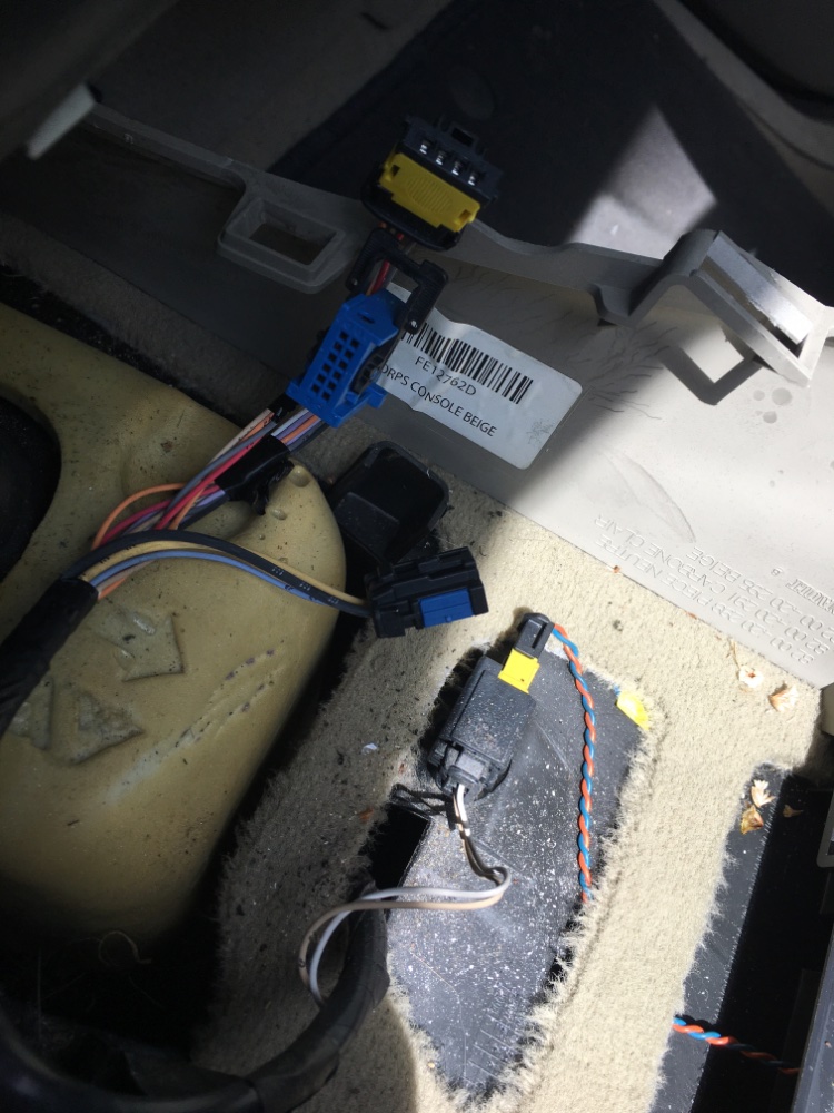 Un peu plus bas, on a la prise pour l’alimentation 12v (prise façon allume-cigare derrière le levier de vitesses), avec les deux fils. Caché derrière le connecteur sur ma photo, encore une prise mystère ! A quatre fils cette fois-ci, et avec le connecteur clipsé à l’embase de la console.