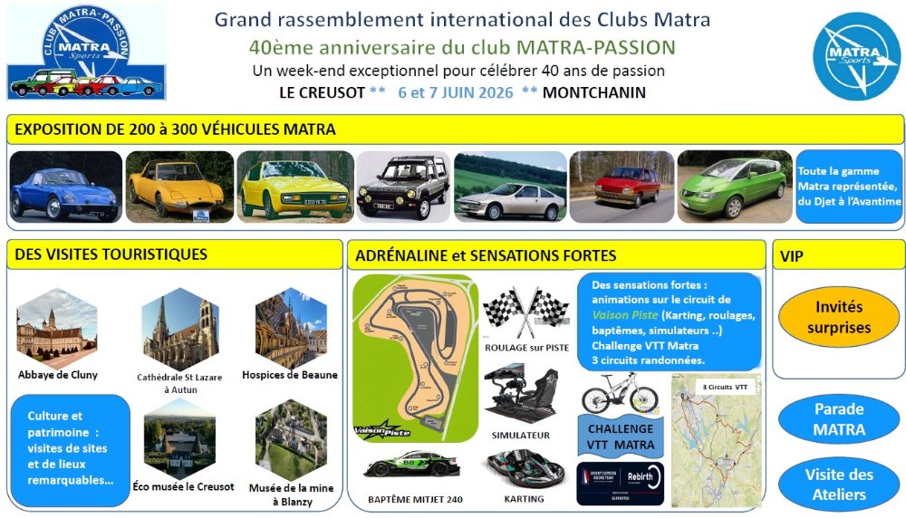 Pour fêter ses 40 ans le club MATRA-PASSION organise les 6 & 7 juin 2026 un "Grand Rassemblement International des Clubs MATRA" sur le circuit de VAISON-piste à 71210 TORCY – France.