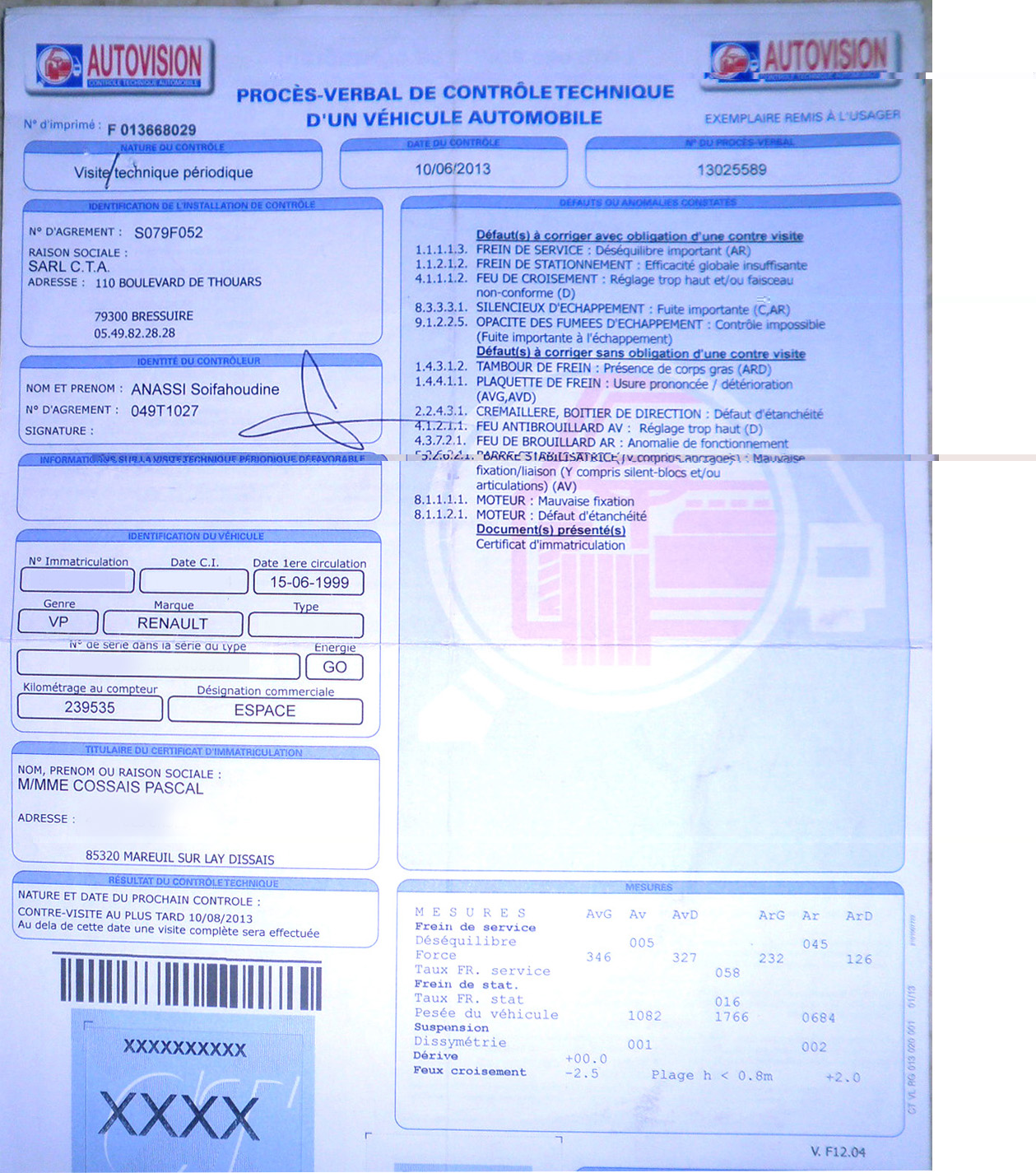 Au passage, j'ai supprimé la seconde image qui ne montre rien de plus à part le déséquilibre prévisible des freins, la date de juin 2013 du CT mais surtout avec toutes les coordonnées pour faire une fausse carte grise ...