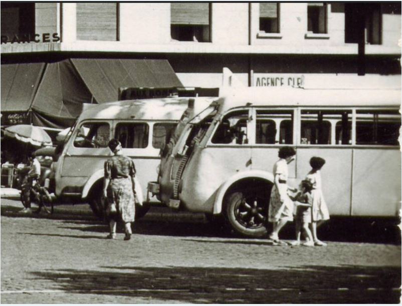 La girouette affiche la direction de Ste-Anne, ce qui laisse supposer qu'il s'agit de la ligne N° 12.La porte arrière avait 2 battants, équipés chacun de petits carreaux ce qui pouvait laisser croire de loin, que c'était une porte à 4 vantaux.