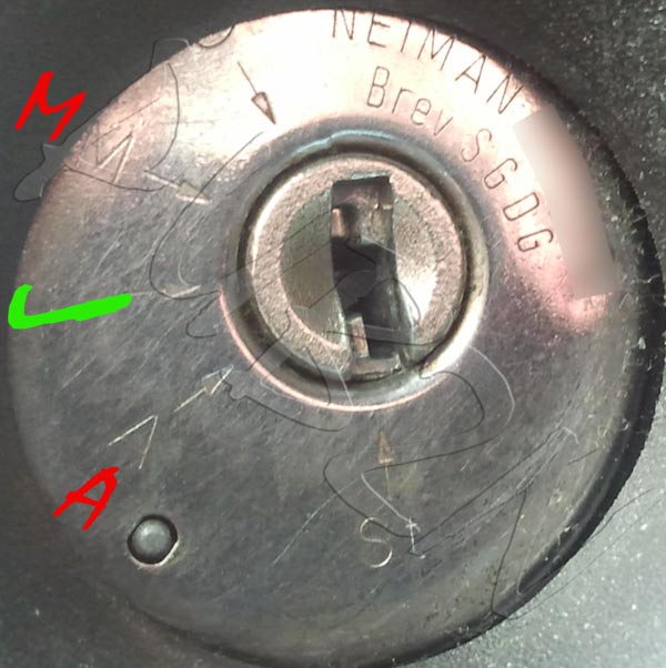 Il faut tourner la clé pour l'aligner soit avec le petit plot gris, soit sur la flèche sans lettre sur ton Neiman (ici signalée en vert)