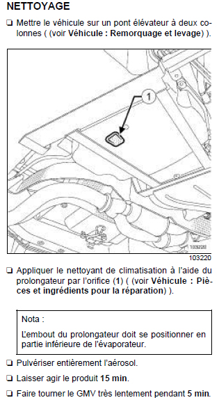 Pour le nettoyer, il suffit d'introduire le long tuyau souple vendu avec la bombe de mousse et la vider dans ce logement. Au bout de 15 minutes, la mousse désinfecte l'évaporateur (c'est un nid à microbes) et ta clim sentira l'orange... On peut le faire soi-même (sans pont élévateur) pour 8 à 12 Euros. Chez Renault c'est beaucoup plus cher.