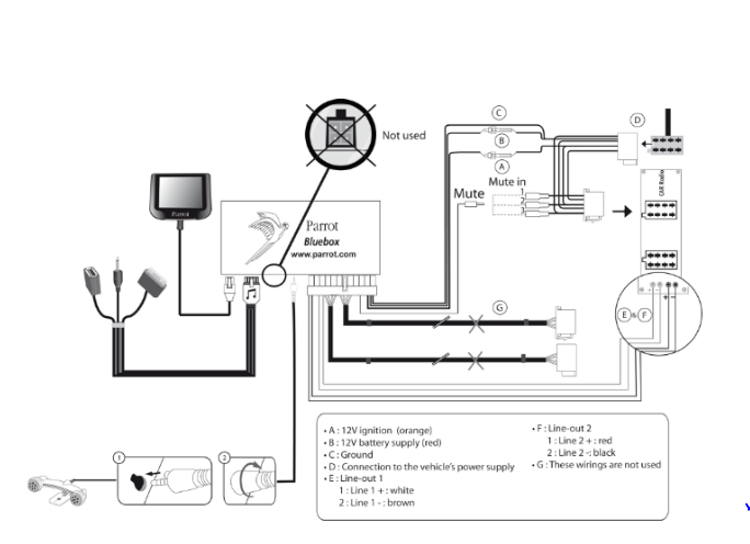 Par contre pour E et F, ils donnent des couleurs mais on ne sait pas à quoi ça correspond pour le branchement sur la ligne de l'autoradio, comme :