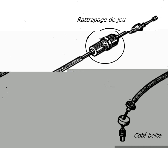 Pour le câble d'embrayage il faut regarder si le rattrapage fonctionne correctement. Au repos le câble côté boîte doit avoir un jeu de 3 à 5 mm à l'état libre sur la fourchette.