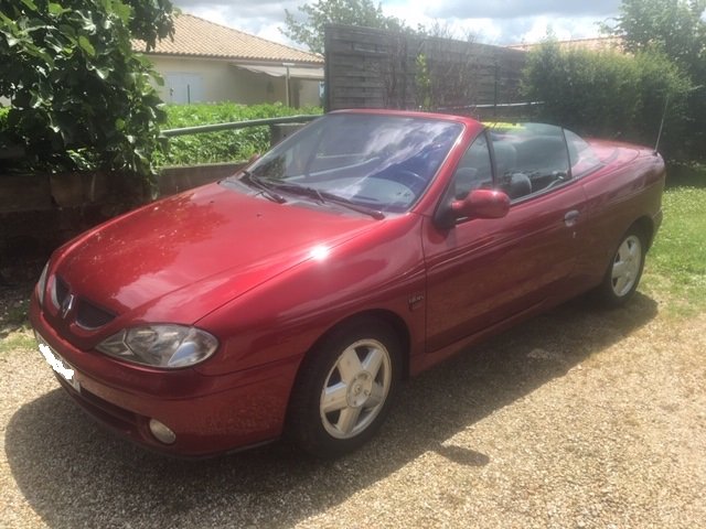 C’est donc une Megane 1 phase 2 cabriolet de 2000, 223000Km, 1.6 16v, payée 1200€ avec CT et entretien à jour. Je ne connais pas la finition, mais elle a la capote électrique bordeaux et la clim.