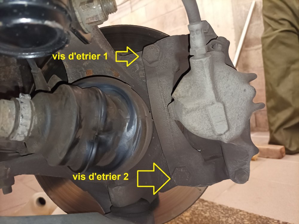 l'étrier de frein (2 vis hexagonaux) (bien l'accrocher à l'amortisseur pour ne pas le laisser suspendu par la conduite hydraulique)