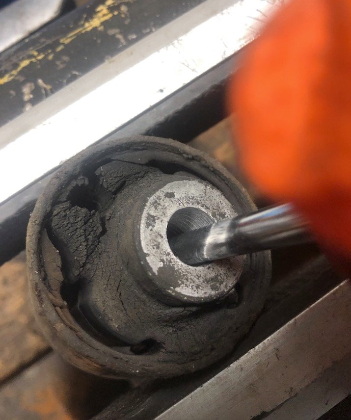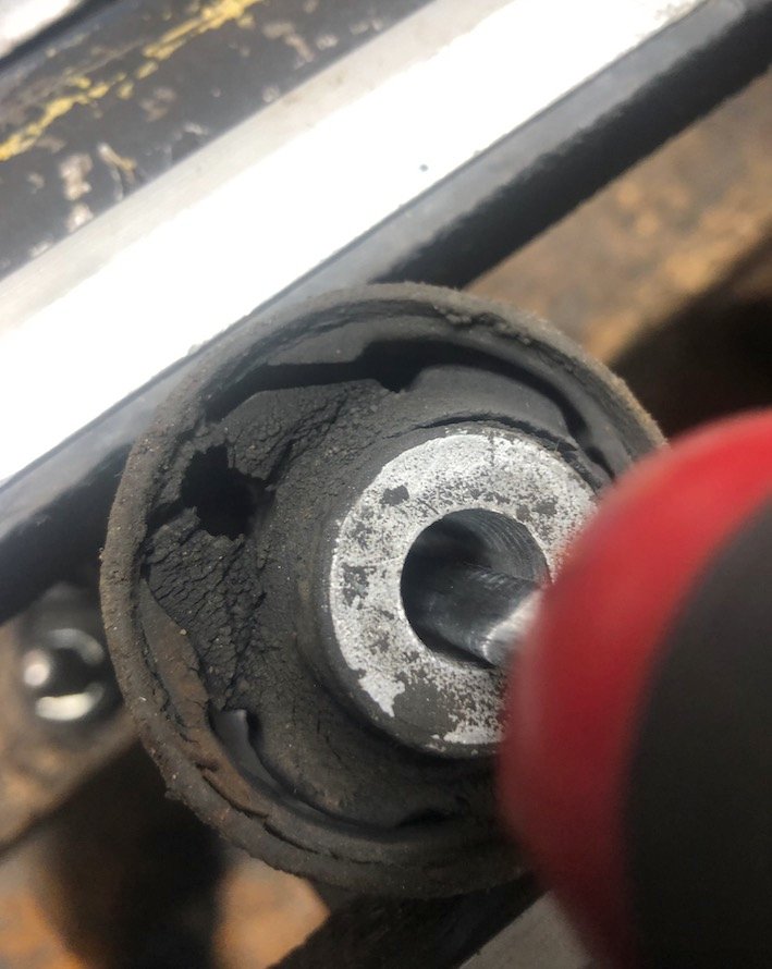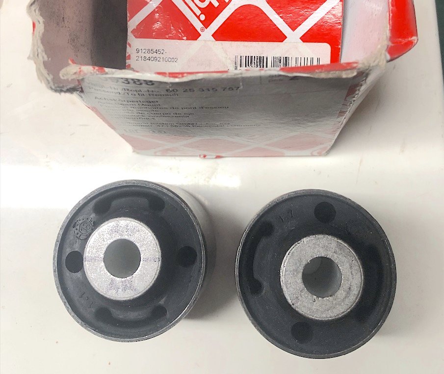 Lors du remplacement des silentblocs à l'arrière, ceux-ci doivent être montés dans le bon sens. Le trou du boulon central n'est pas concentrique avec le corps du silentbloc. Je pense avoir raison en disant que le trou doit être aligné vers l'arrière du véhicule. Vérifiez dans le manuel.